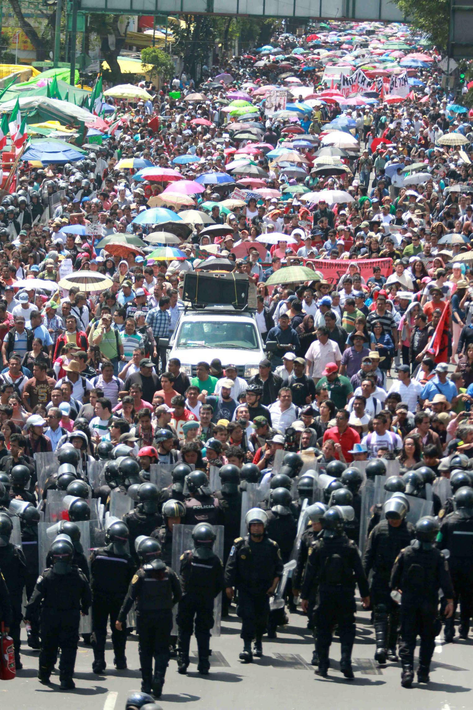 30901081. México, D.F.- Manifestantes de la Coordinadora Nacional de Trabajadores de la Educación (CNTE) arribaron al cruce de Congreso de la Unión y Fray Servando, donde se ubican las vallas de aproximadamente tres metros que impiden su paso hacia la Cámara de Diputados.