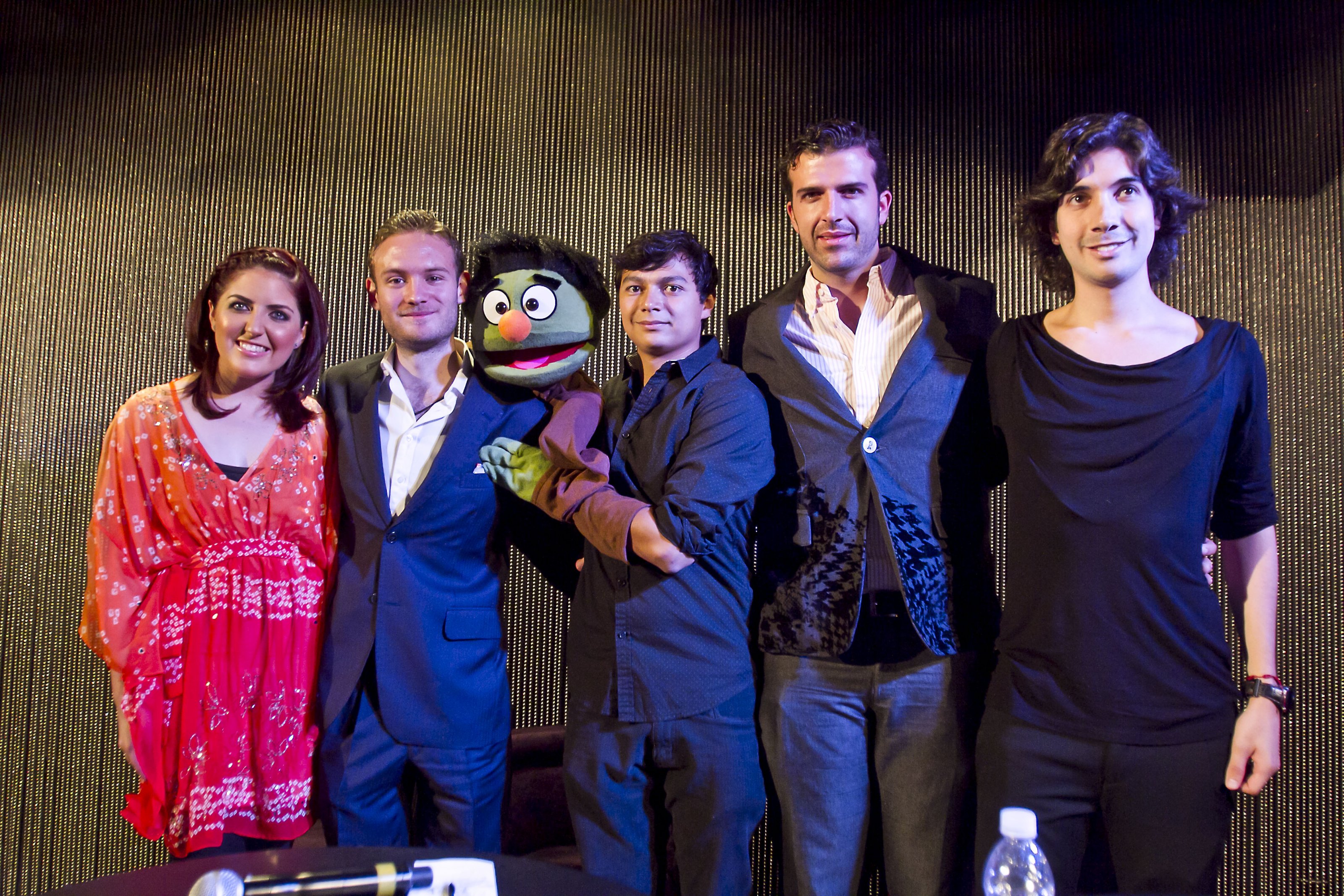 MEXICO CITY, MEXICO. July 31. Melissa Hallivis, Hector Ignacio Serrano; Bruno Carrera (Director); Virgilio Solorio (productor); Jose Carlos Leiva; during Press Conference to announce the staging of "Avenue Q the musical" at Fat Crow Antara Polanco. (photo by Luis Ortiz / Clasos).