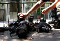 Photojournalists place their cameras on the floor during a demonstration condemning the alleged murder of fellow journalist Regina Martinez in Mexico City, Sunday April 29, 2012. The Mexican government’s human rights commission said Sunday that it will investigate the apparent slaying of a correspondent for Proceso newsmagazine who often wrote about drug trafficking. Police found the body of Martinez on Saturday inside the bathroom of her home in the Veracruz state capital, Xalapa. (AP Photo/Marco Ugarte)