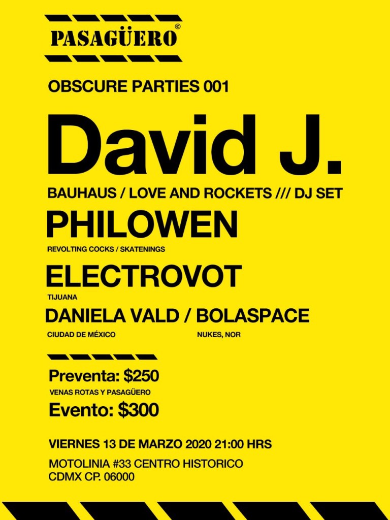 El próximo 13 de marzo de 2020; Club Revolt de Los Ángeles y Venas Rotas Discos de CDMX, traerán un gran elenco electro-goth e industrial que pondrá a todos a bailar durante toda la noche en el PASAGÜERO.