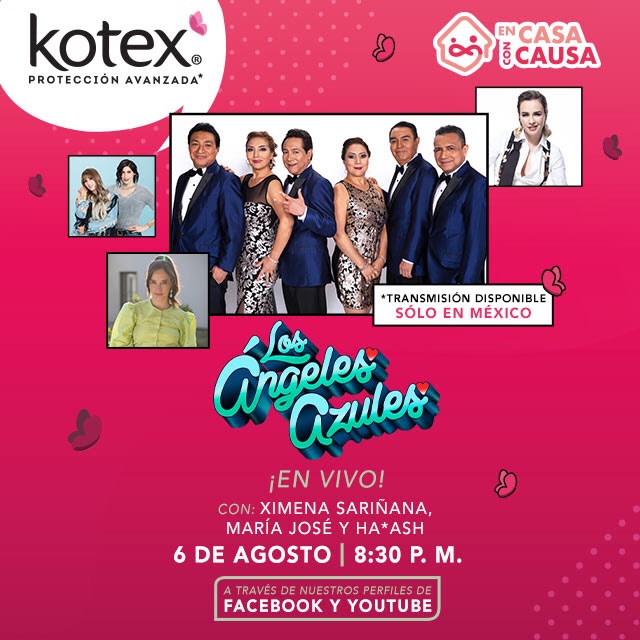 Este jueves 6 de agosto a las 8:30 pm, Los Ángeles Azules ofrecerán un showcase como parte del concepto Kotex presenta… En Casa con Causa, a través de los canales de Facebook y YouTube de la marca y el de Los Ángeles Azules, la conducción correrá a cargo de Ileana Rodríguez “La Reclu”.