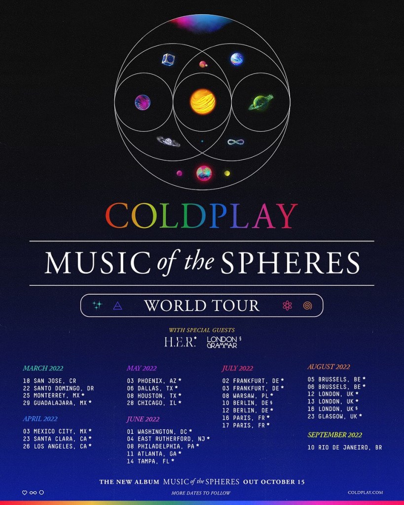 En la víspera de su nuevo álbum, Music Of The Spheres, Coldplay anuncia hoy una gira mundial en estadios para el 2022.