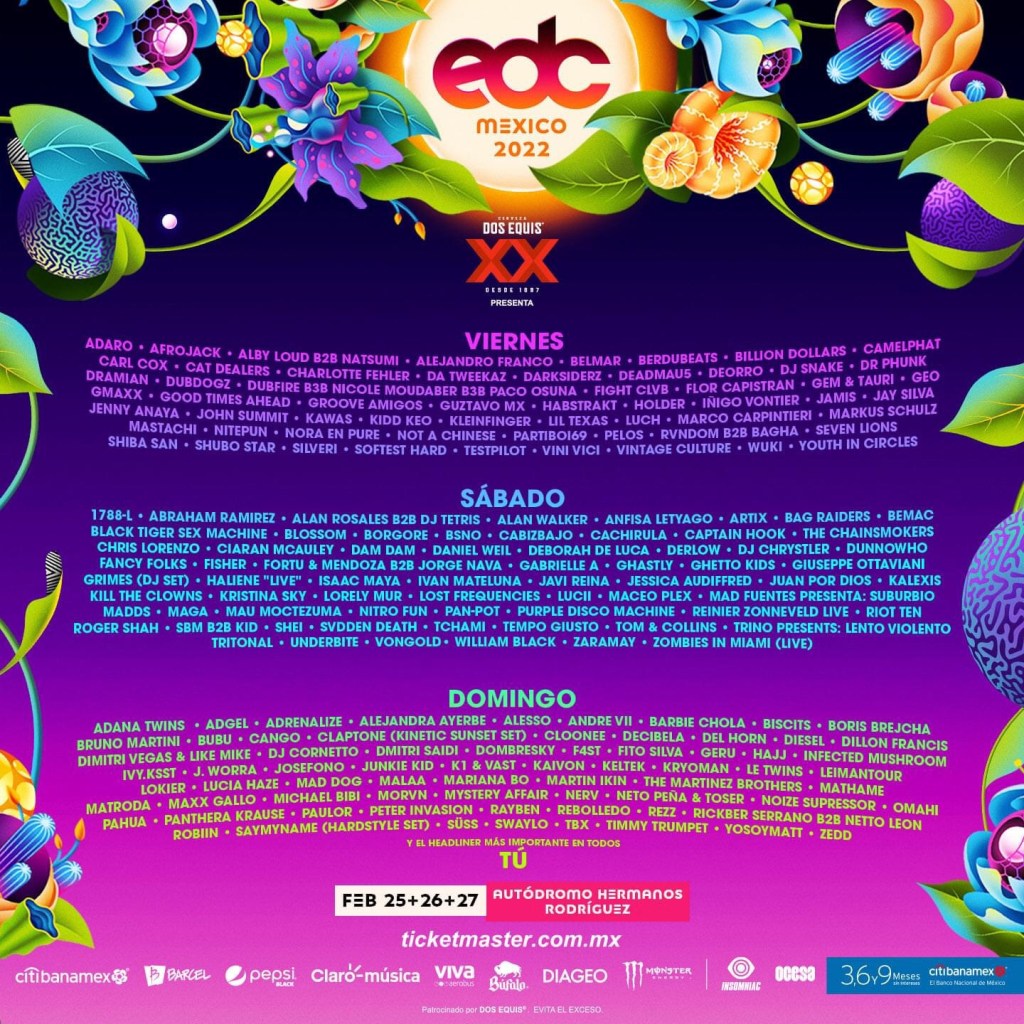 El EDC (Electric Daisy Carnival), anuncia más de 192 actos en vivo, que se podrán disfrutar en su edición 2022. Es así que los amantes al EDM, house, dance, electro, drum and bass, techno, dance-punk, hard dance, dubstep, trance y más, enloquecerán con la presencia de los mejores y más importantes exponentes del género como Deadmau5, Boris Brejcha, Carl Cox, Maceo Plex, Dubfire b3b Nicole Moudaber b3b Paco Osuna, DJSnake, The Chainsmokers, Alesso, Grimes, Dimitri Vegas & Like Mike, Zedd, y muchos más, quienes serán los responsables de encender los ánimos de los miles de “headliners” que se den cita los próximos 25, 26 y 27 de febrero de 2022 en el Autódromo Hermanos Rodríguez.