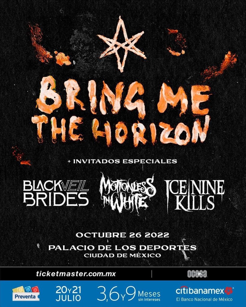 La banda británica Bring Me The Horizon, llegará al Palacio de los Deportes para ofrecer un concierto este 2022. Y no lo harán solos, ya que la noche del 26 de octubre se convertirá en un festival sónico de rock y metal con los invitados especiales: Black Veil Brides, Motionless In White y Ice Nine Kills.