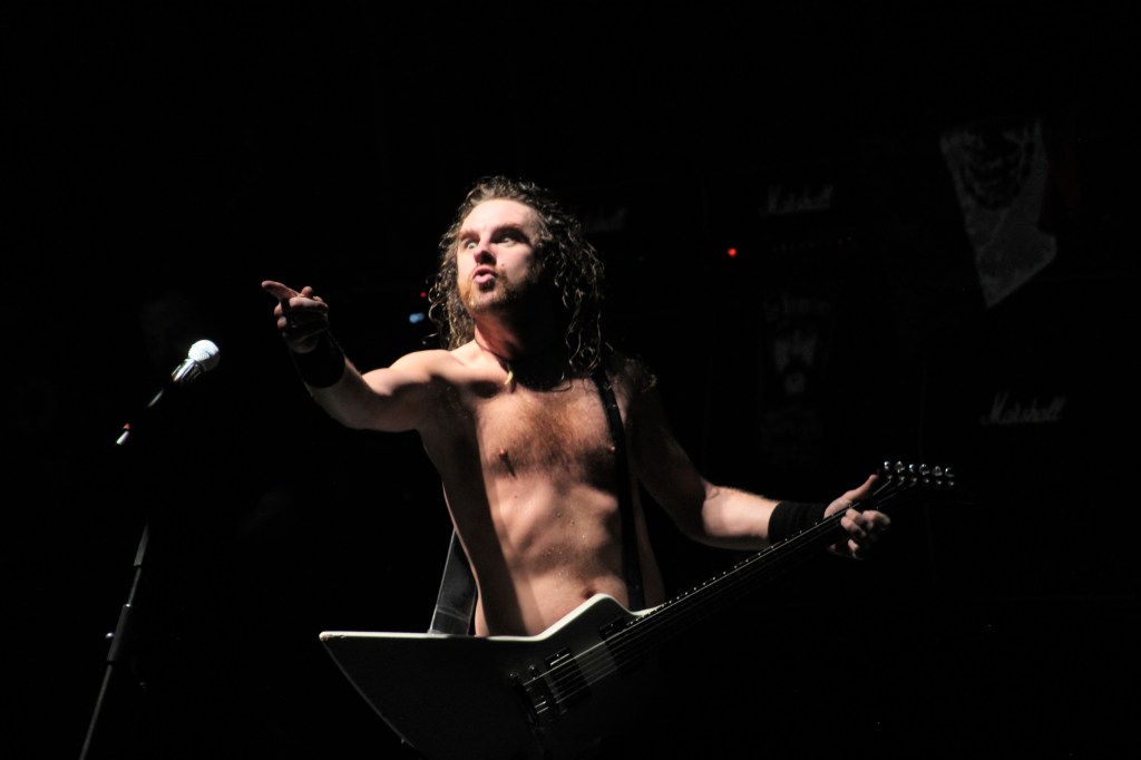 El momento de Airbourne llegó al escenario y con «Ready to Rock» nos avisan que viviremos una noche de mucha energía sin parar, desde el inicio y con canciones como «Too Much, Too Young, Too Fast» se erige como principal protagonista su frontman Joel O’keeffe; un rockero desenfrenado, sin camisa y que no para de saltar sobre el escenario, él y su banda siguen con su descomunal rock duro con «Girls in Black» y «Burnout the Nitro«.