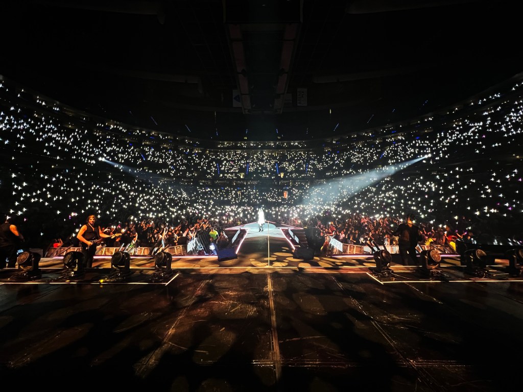Después de un medley rockero, género que le encanta a Pausini, donde se escucharon Yo canto y Emergencia de Amor, el repaso de esas tres décadas de carrera apenas comenzaba mientras la pasarela del escenario en forma de flecha apuntaba a los presentes. Laura mostró su versatilidad y sentimiento sin igual, acompañados de cambios de vestuario, coristas poderosos e incluso bailarines que hacían del show algo llamativo.