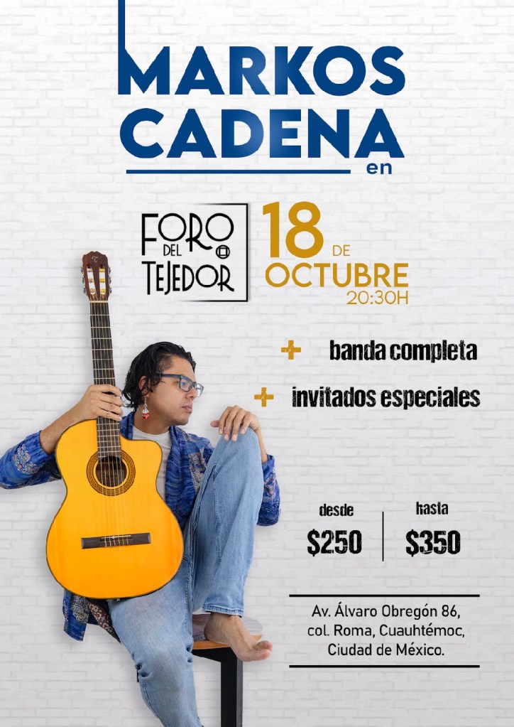 El cantautor mexicano Markos Cadena se presentará este 18 de octubre en el Foro del Tejedor. Sus canciones, con influencias de la trova y letras llenas de sarcasmo e ironía, conectan con el público a través de historias que invitan a la reflexión.